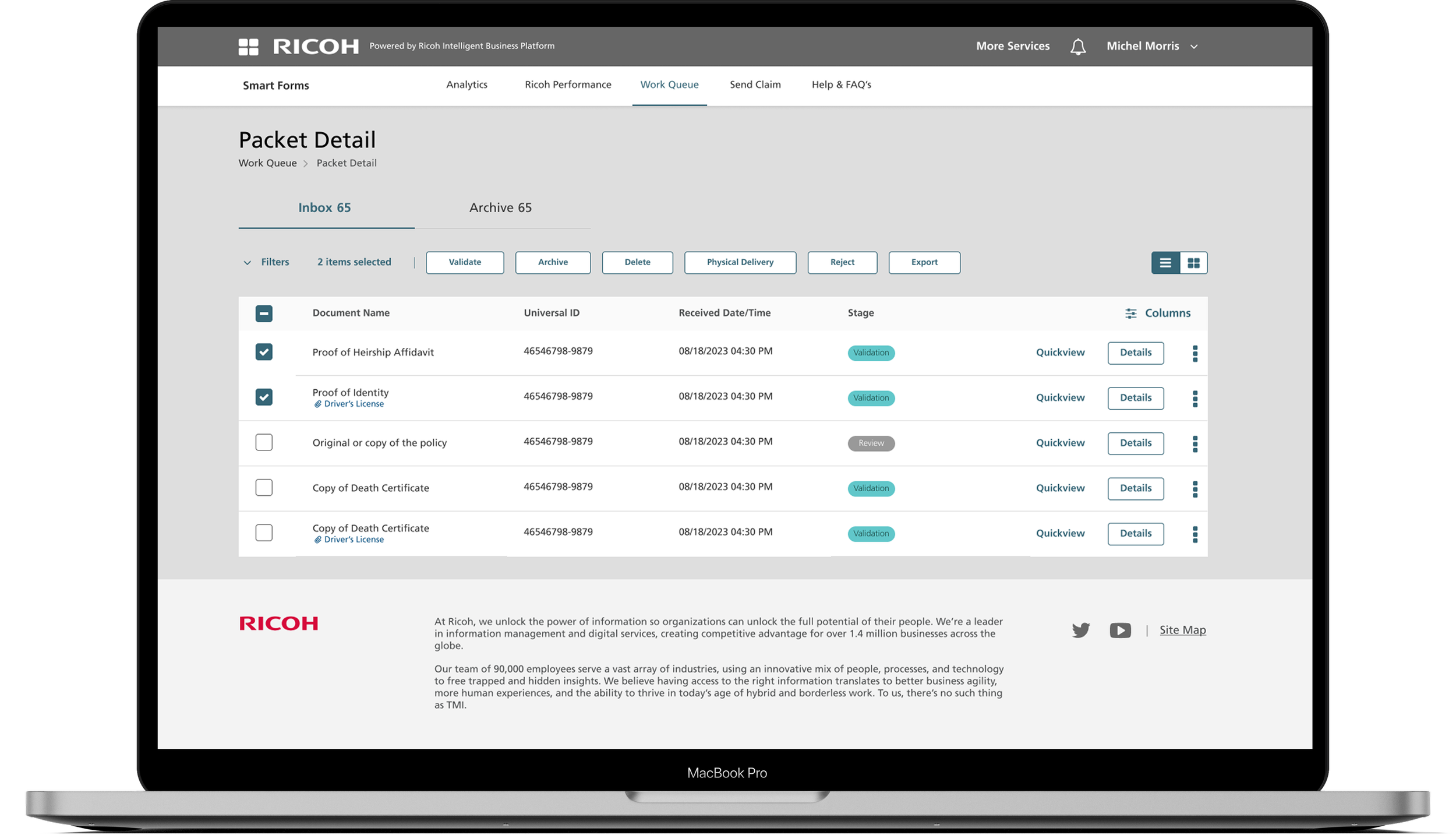 The Packet Detail feature lets you view all documents within a packet, including each document’s ID, the date and time it was received, and whether it requires review. From here, you can also select the next document you need to validate, making it easy to manage and track your work efficiently.