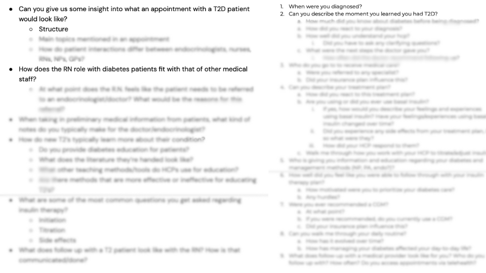 We conducted 12+ in-depth interviews to gather qualitative insights from individuals living with diabetes and healthcare professionals, including endocrinologists, UC San Diego Medical School professors, PharmDs and nurses.